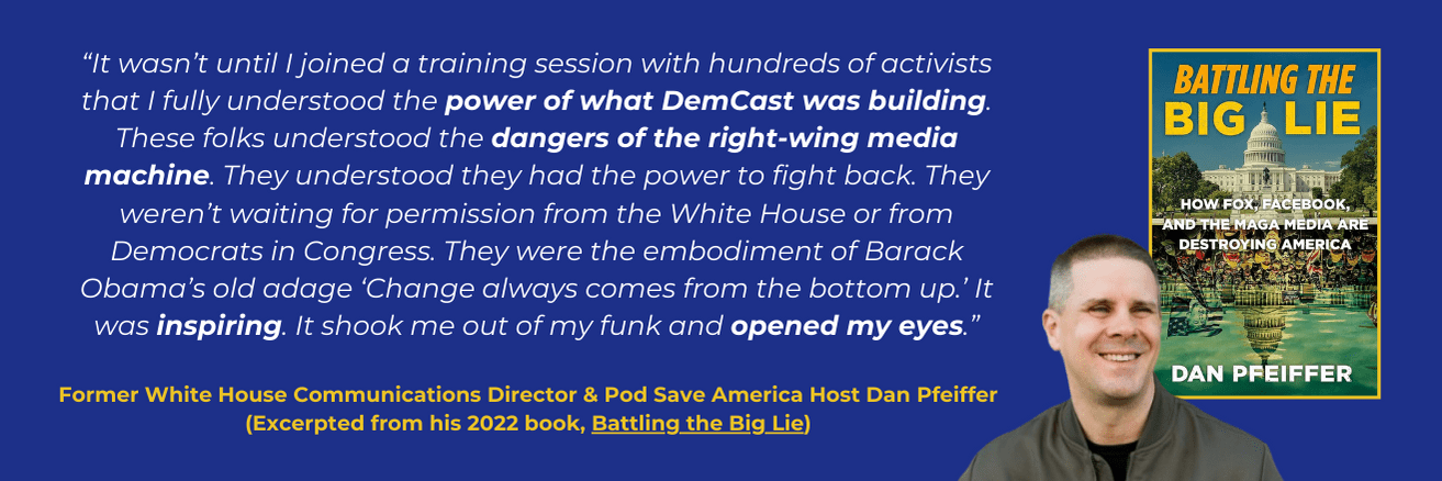 DemCast’s staff and Board of Directors is filled with experienced, effective difference-makers from across the pro-democracy movement. Activists, from Boomers to Gen Z. Former Elected Representatives. Experts. Topline Messengers. On-The-Ground and Digital Organizers. Meet our leadership team here…